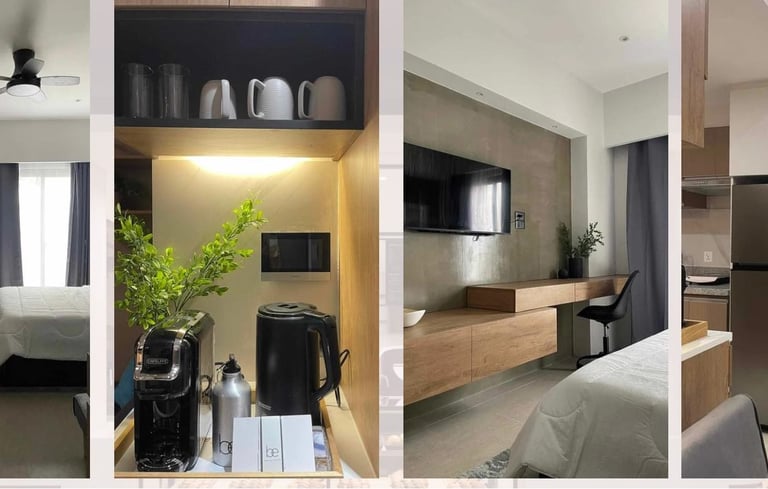 Designed to feel like home. Polished concrete walls for a clean, sophisticated backdrop Cozy, contemporary furnishings that welcome you in. Located at BE Residences, Lahug, Cebu City